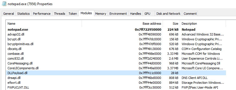 Looking into the modules loaded by Notepad, we can also see the name of our pay (DLLPayload.dll).
