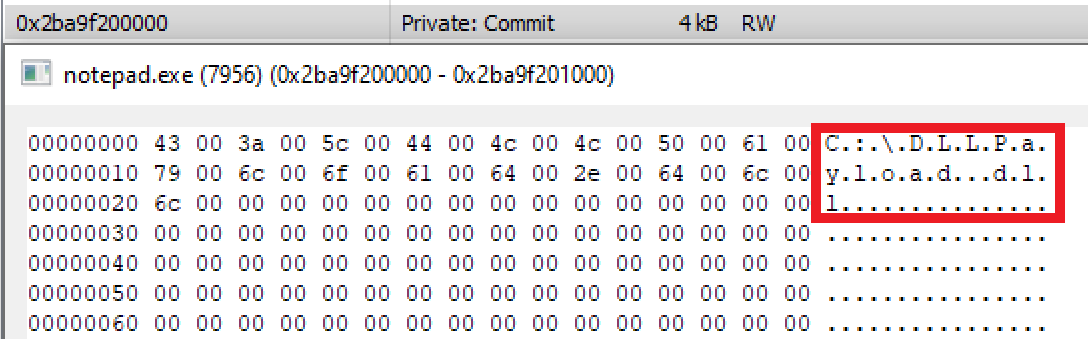 }After a memory buffer has been allocated in the target process the path to the DLL payload must now be written to it. The path to the DLL payload is defined as: